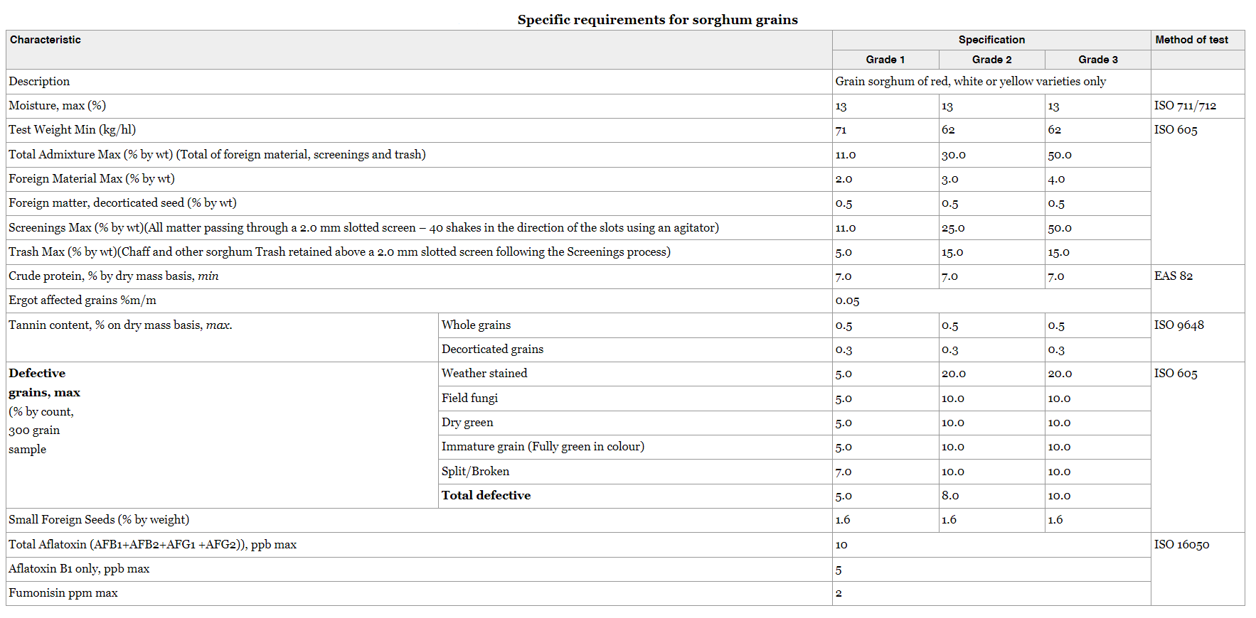 Sorghum grains shall meet the following general requirements/limits as determined using the relevant standards listed.